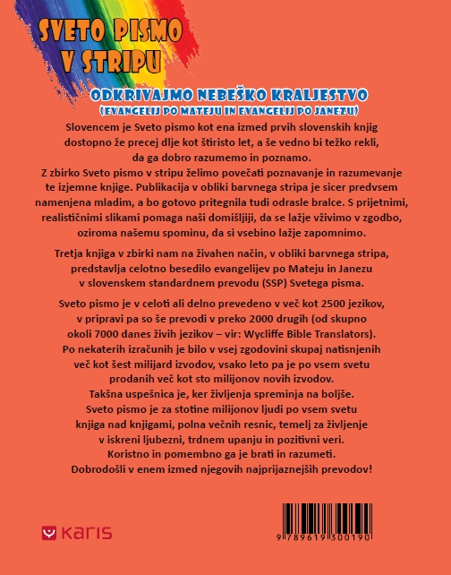 Zbirka Sveto pismo v stripu je prva publikacija v slovenščini, ki v stripu uporablja celotno, nespremenjeno svetopisemsko besedilo. Barvni strip je sicer na prvi pogled predvsem za mlade, vendar pritegne tudi odrasle. S prijetnimi, realističnimi slikami pomaga naši domišljiji, da se lažje vživimo v dogajanje oziroma v zapisane besede, in našemu spominu, da si jih bolje zapomnimo. Upamo, da bo ta zbirka olajšala in spodbudila razumevanje Svetega pisma, ki je trden temelj za življenje v iskreni ljubezni, trdnem upanju in pozitivni veri. V prvih treh knjigah je uporabljen sodobni prevod Življenje z Jezusom (Apd, Lk, Kol, Jk in 1 Jn) in standardni slovenski prevod (Mt, Jn, 1 Pt, delno Ef in 1 Tes). Več na www.ekaris.net/sps ...